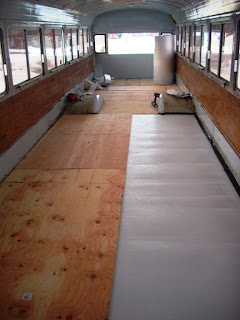 We've already put in many an hour on our newly beloved bus-o-la. We had to rip out the seats and overhead storage bins, take out the heaters (which involved WAY more anti-freeze than we wanted to deal with), sweep, and rip up the plywood and linoleum. So with a floor of sheet metal, we cleaned the crap out of it and removed any leftover nails, screws, rubber matting, and grime. Fun. But THEN! Today we got our 100 feet of insulation (which is a three layer system of two sheets of "bubble wrap" and a layer of reflective material; commonly used in floors in houses) and our grade C mahogany plywood. We laid down the insulation and Gorilla taped the seams (hey, it works as a weather barrier, too! and what would a house bus be without duct tape?!). Then we cut our plywood with our circular saw and fit them into place (with only a little convincing). It looks GREAT and tomorrows project is to cut out a piece of plywood to fit in the last spot in the front and screw everything down. We now have an insulated floor!